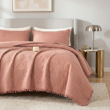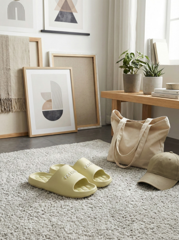 极简风格卧室室内设计,以浅米色墙面为背景,搭配原木色实木床架,铺着浅灰色亚麻质感床单,床头摆放两个浅米色方形靠枕和两个浅灰色长条形枕,床尾随意搭着一条米白色针织毯。床的左侧是原木色床头柜,上面放置一个白色陶瓷小花瓶,插着几根干枝,旁边有一个白色小茶杯和托盘。床头柜上方墙面挂着一幅极简风格装饰画,画框为原木色,画面是三束黑色线条勾勒的麦穗图案。床的右侧是一盏白色金属落地灯,灯罩为米白色布艺材质。床前浅色木地板上铺设一块米白色长方形棉麻地毯,地毯上放着一个圆形编织篮,篮子里有一本翻开的书。整体色调以米色、浅灰、原木色为主,光线柔和,营造出宁静、舒适、简洁的氛围,空间布局对称平衡,线条干净利落,无多余装饰,体现极致的简约美学。