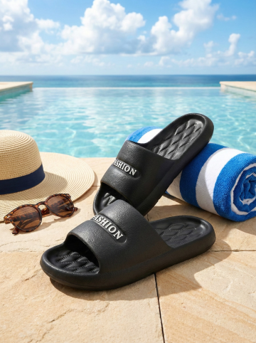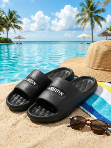 保持原图主体不变,更改背景,一双轻便的凉拖鞋摆放在沙滩或泳池边,背景是蓝天白云或清澈的水面,旁边可能有太阳镜、草帽或沙滩巾,传递出清爽的夏日气息,图片比例是3:4,分别生成10张拖鞋摆放姿势不同的图片