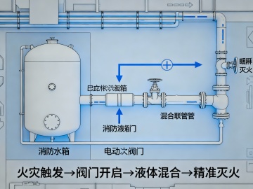 大楼消防水箱额外架设消防液箱 , 当火灾时 , 大楼消防水箱与消防液箱连接的管路阀门会自动开启 , 让消防液箱内的消防液能立即与大楼消防水箱内的消防水融合 , 让大楼消防喷洒系统能立即灭火。