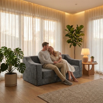 简约主义风格客厅,柔和灯光与绿绒沙发营造舒适温馨氛围,实景感十足,面料风质感细腻,传递宁静生活美学。