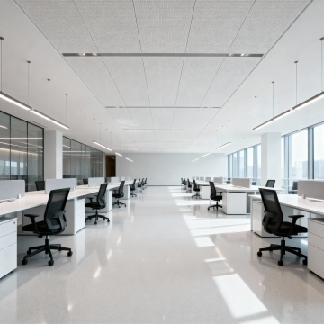 现代简约风格的办公室环境,开放式办公区布局,浅灰色与白色为主的中性色调,大面积落地玻璃窗引入明亮自然光,搭配白色条形吊灯和嵌入式筒灯提供均匀照明,灰色几何图案地毯覆盖地面,白色办公桌配深灰抽屉柜,黑色框架米色坐垫办公椅,办公桌间有半人高白色隔断,角落摆放大型绿植增添生机,金属与玻璃材质的百叶窗隔断,办公桌上配有笔记本电脑和黑色办公电话,整体空间干净整洁、通透开阔,光线充足柔和,营造出专业高效且舒适的工作氛围。