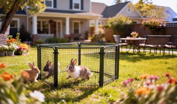 美式庭院场景,中央放置小宠围栏,围栏内几只兔子正在玩耍,背景是美式风格的建筑物并适当虚化,庭院中有草坪、花卉和休闲桌椅,阳光明媚,整体氛围温馨自然