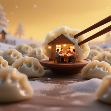 冬至夜雪落窗前,暖灯映照热腾腾饺子,水墨大字“冬至”飘雪而立,3D光影营造梦幻中式温馨氛围,虚拟现实感十足。