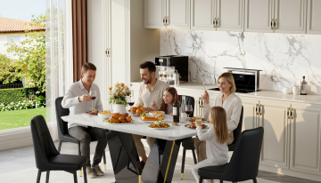 温暖晨光中的厨房场景,轻拟物风搭配简约主义设计,柔和色调与面料质感营造温馨舒适氛围,实景感十足,传递居家生活的宁静与惬意。