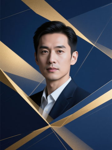 人像处理为单色银灰调,身着西装,背景为流动的数据点阵光影。
