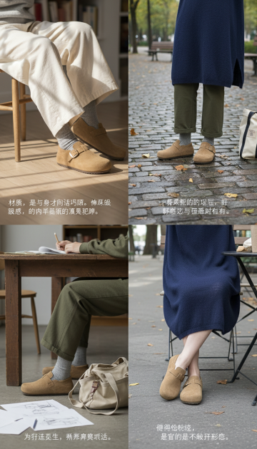 视觉: 女性模特(同样追求不露脸的意境)搭配阔腿裤、长半裙、简约连衣裙。场景在工作室、咖啡馆露台、家里堆满书的角落。