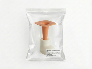 一个白色哑光材质的长方形自立袋包装,袋身中央有轻微的弧形内凹设计,边缘有一圈银色亮边,底部有细密的锯齿状压纹封口,整体呈现出简洁干净的包装设计感,高分辨率3D渲染效果,光影柔和,在白色背景下独立展示,具有现代简约的产品包装视觉风格。