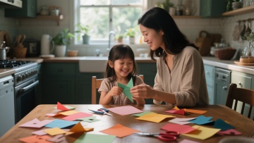 东亚风实景感画面,柔和光影洒落,孩童专注书写,手账风与水彩质感交织,营造温馨舒适、清新质朴的居家学习氛围。