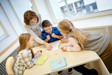 温馨的教室里,老师与学生互动,水彩插画风展现教师节的卡通感与温情。