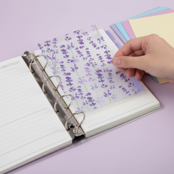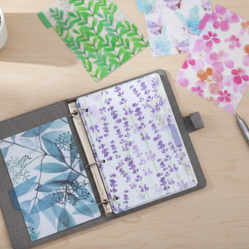 A5 6孔活页孔笔记本扣着盖着,在桌面白底俯视,活页孔笔记本活页扣里面有着A5半透明森系图案索引页,笔记本活页扣套着透明外壳,旁边有着一些夹子,散落着一些彩铅,有着橡皮