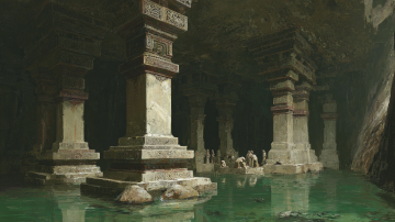 大鱼海棠画风。一座位于巨大地下空间中一片地下湖中央的石制祭祀用建筑,四周有巨大的石柱支撑地下空间,其内保护着一条可以通往仙境的暗河。 关键词:古老、祭祀、藏族、神秘、宏伟、石刻