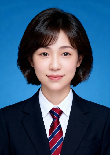参考第一张图保留人物脸型、发型、年龄特征生成证件照标准样式,肤质优化处理提亮肤色,均匀肤色;外穿高级深灰色西装,内搭白色翻领长袖衬衫,搭配细条纹领带;参考第二张图的人物占位和比例,居中平视正面视角,纯正面,胸部以上半身像;消除暗沉轻度磨皮,轻度美颜,去除一切饰品;光线均匀柔和,画质清晰,表情自然,头部完整,去除人物之外的所有元素,简约蓝色纯色背景;严格按照第一张图的内容生成。
