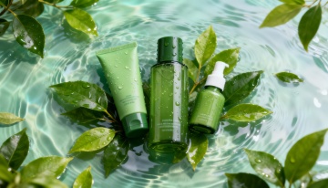 清新玻璃瓶置于虚拟自然水景中,花影轻舞,尽显清爽与清透感。