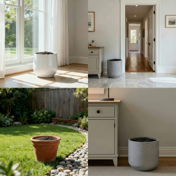一系列6个不同的室内绿植及园艺元素的集合,每个元素独立展示,采用与原图一致的高细节3D渲染风格,柔和的米白色纯色背景,温暖的米色、浅棕色、淡黄色和白色为主色调,精确的光影效果,清晰的材质纹理。元素包括:1. 浅灰色陶土花盆中的多肉植物组合,叶片饱满有光泽,点缀小石子;2. 透明玻璃花瓶插着干枯的尤加利叶和白色小雏菊,瓶口系着浅棕色麻绳;3. 复古铜色浇水壶,壶嘴弯曲,壶身有细微划痕,壶内装有半壶清水;4. 编织篮筐里的常春藤,藤蔓自然垂落,叶片呈心形,颜色从深绿到浅绿渐变;5. 白色陶瓷小花盆里的薰衣草,紫色花穗饱满,叶片细长;6. 木质托盘上的三小盆不同种类的迷你绿植,托盘边缘有自然木纹。所有元素排布规整,大小统一,间距均匀,保持相同的光照方向和阴影效果,整体呈现简洁、温馨、自然的居家园艺氛围。