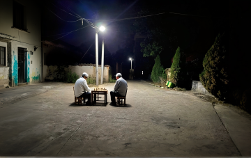 一对头发花白的老年夫妇在不同的户外场景中温馨互动的画面,背景可以是公园的林荫道、湖边的长椅、山间的小径或宁静的花园等。两位老人面带温暖灿烂的笑容,神情愉悦自然,老爷爷穿着浅灰色的长袖针织衫,老奶奶穿着米色的高领内搭和同色系的开衫马甲,老奶奶手中捧着一个白色的茶杯,老爷爷的手臂亲切地搭在老奶奶的肩上,两人姿态亲密和谐。画面整体采用写实风格,光线明亮柔和,以自然光为主,呈现出温暖的色调,绿色的植物背景郁郁葱葱,充满生机,营造出宁静、幸福、安逸的氛围,整体构图清晰,主体突出,细节丰富,具有生活气息和情感温度。
