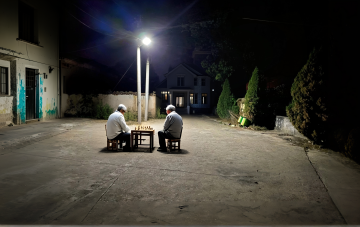 温暖柔和的晨光透过木质窗棂洒入室内,照亮了一对老年夫妇的背影,老先生穿着浅色衬衫,戴着眼镜,左手轻轻搭在身旁穿着碎花上衣的老太太肩上,两人依偎着望向窗外,窗外可见翠绿的树枝,室内窗台上摆放着古朴的陶瓷茶壶、茶杯和一盆红色花卉,整体画面呈现出温馨、宁静、岁月静好的氛围,光影层次丰富,色调温暖偏黄,具有高度写实的质感和细腻的细节刻画。