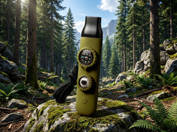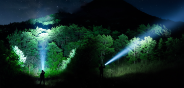 背景是夜晚森林中的地上,一支黑色战术手电筒的特写,一半的体积被雨水浸泡在水中(从地面泼溅而起,激起水花,水花晶莹剔透,折射着光线),背景是森林。