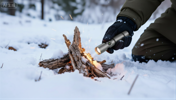 背景是森林中一块灰黑色的石头上,一支手电筒的特写,被包裹在一股泼溅的水中(从地面泼溅而起,激起水花,水花晶莹剔透,折射着光线)