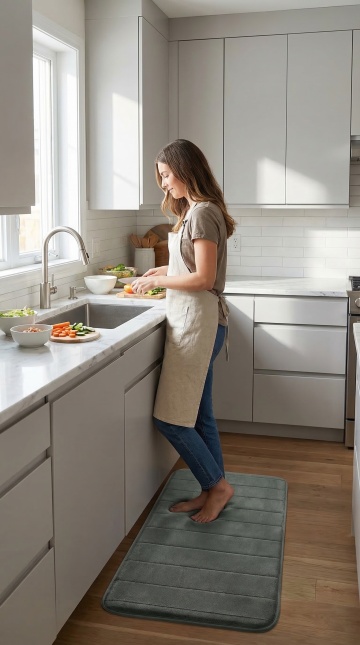 现代简约厨房,性冷淡风设计,搭配舒适质感地垫,营造清新自然的实景生活氛围,突出面料纹理与空间美学。