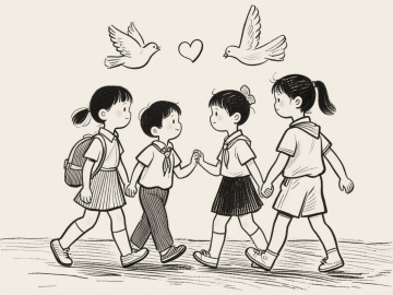 黑白线条勾勒的童趣插画,四名学生手牵手前行,飞鸟与爱心点缀天空,清新温馨的漫画风传递纯真友谊。