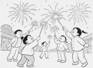 水彩风插画,梦幻烟花映雪夜,孩童手握烟花奔跑,温馨喜庆,卡通感十足,手账风细节,印象画派笔触渲染节日氛围。