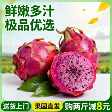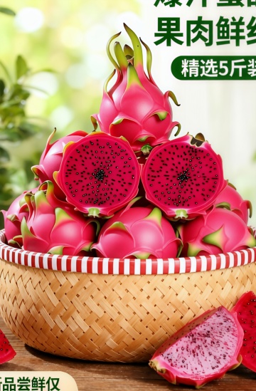 一张水果促销海报,画面主体为一个浅棕色编织纹理的手提篮,篮子里装满了新鲜饱满的火龙果,旁边散落着几片带绿叶的火龙果切片,整体放置在木质桌面上,背景是模糊的绿色植物营造出自然清新的氛围。主色调根据火龙果的颜色调整,保持明亮鲜活的视觉效果,光影柔和,水果表面有自然的光泽感和细微的纹理细节。海报上方有绿色大号文字“玫红爆甜,自然熟成”,右侧绿色标签写着“精选5斤装”,底部左侧是橙色价格标签“新品尝鲜仅 15.9元”,底部右侧有绿色文字“精选当季新果 | 新鲜尝鲜 | 精选5斤装 坏果包赔”,字体选择无衬线体,整体排版清晰,视觉层次分明,信息传达直接高效,符合水果生鲜产品的促销宣传目的,设计风格保持原有的写实摄影质感和商业海报的简洁明了。