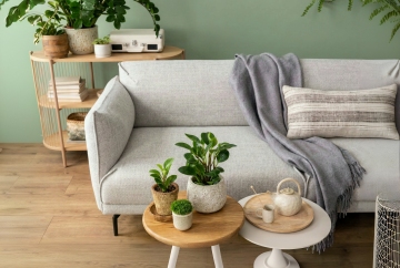 极简主义风格室内背景,柔和的暖米色墙面与浅木色人字拼地板,自然光透过轻薄纱帘洒入形成柔和光影,顶部悬挂金色金属支架白色球形吊灯,墙面装饰简约线条艺术挂画,摆放不同造型的浅灰色布艺沙发搭配莫兰迪色系靠垫,低矮几何形状茶几上放置绿植装饰,角落处大型热带植物增添生机,整体空间呈现干净利落的线条感与舒适宁静的氛围,采用与原图不同的摆设布置、内容、配色和风格设计。