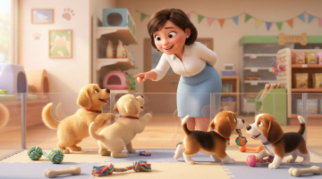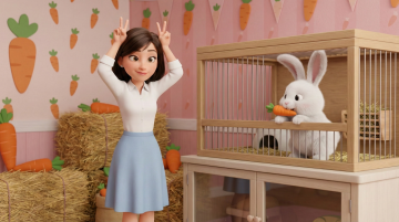 3D角色的女教师Vivian(穿着标志性的白衬衫和浅蓝裙, 3D造型圆润亲和)位于中景,**保持站立姿态**。她表情既惊喜又带着一丝小心翼翼(为了呼应脚本后半段怕它跳出来),身体微微后倾但手指指向前方。