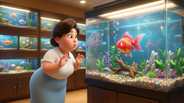 老师面前是一个巨大的、模仿自然环境的玻璃生态展示缸(Terrarium)。缸内布置成了一个迷你的**池塘湿地景观(Pond Habitat)**,有清澈的浅水、鹅卵石和各种水生植物。视觉中心是一片巨大的漂浮**荷叶(Lotus Leaf)**,一只翠绿色、大眼睛的卡通青蛙(Frog)正安静地**蹲在荷叶中央**。