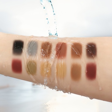 根据参考图1,生成一张手部彩妆产品的防水性能测试场景,手部分别涂抹了图二10款颜色的粉末(眉粉、修容粉或眼影这类粉状彩妆),有水淋在彩妆区域,目的是测试该产品的防水、防汗持久度