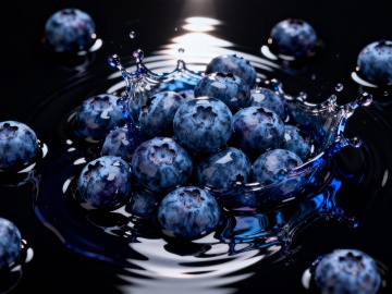 超写实风格的蓝莓背景,深蓝色调为主,点缀水珠的光泽与水花四溅的动态效果,几颗饱满的蓝莓悬浮于半空,底部是盛满蓝莓的玻璃碗,周围环绕着晶莹的水滴和几片翠绿的叶子,背景带有朦胧的光斑,整体营造出清新、水润且富有生命力的氛围,光影层次分明,细节质感细腻,水珠的透明感和蓝莓的紫黑色泽形成鲜明对比,构图饱满且富有动感,适合作为具有自然清新设计感的背景使用。