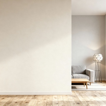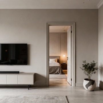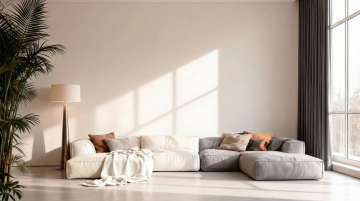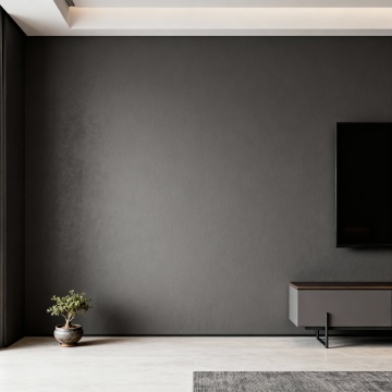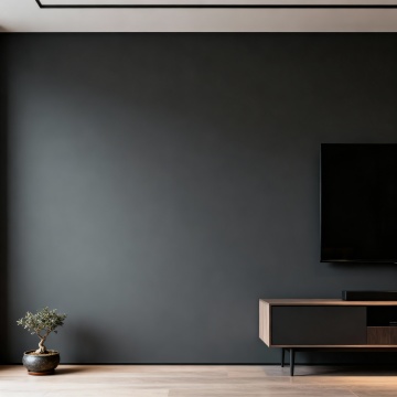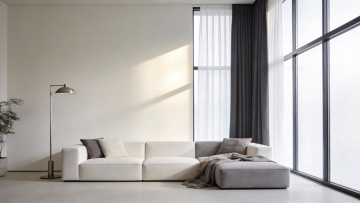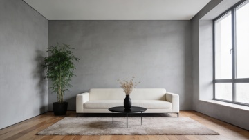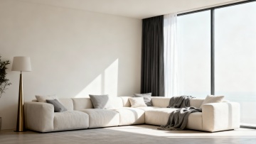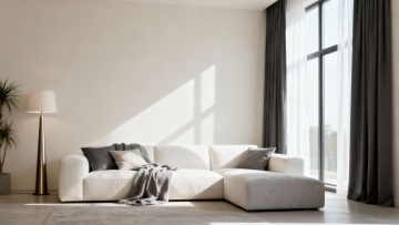 现代简约风格的客厅室内设计,主体为一个线条流畅、造型独特的模块化布艺沙发,沙发采用深灰色高级绒布面料,搭配几个不同大小和纹理的几何图案靠垫,沙发下方是纤细的金属支撑腿。客厅整体色调以冷静的灰蓝色为主,墙面为浅灰色哑光质感,地面铺设浅色宽木地板。左侧有一扇大窗户,悬挂着半透明的浅灰色垂坠感窗帘,阳光透过窗户柔和地洒入室内。沙发前铺着一块浅灰色带有细腻纹理的长方形地毯,地毯上放置一个圆形黑色金属框架小茶几,茶几上摆放着一本翻开的设计杂志和一个简约的陶瓷花瓶。沙发后方的墙上挂着一幅抽象的几何线条装饰画,画框为细黑色。右侧角落放置一盆大型的琴叶榕绿植,增添自然气息。天花板中央悬挂着一盏造型简约的黑色金属吊灯,灯光温暖柔和,营造出宁静、舒适且富有设计感的居住氛围。整个空间布局合理,注重留白和线条的简洁,展现出北欧极简主义的设计美学。