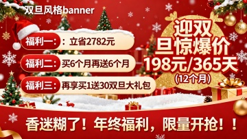 左边"福利一:立省2782元“"福利二:买6个月再送6个月“"福利三:再享买1送30双旦大礼包“ 右面”迎双旦惊爆价 198元/365天(12个月)“ 底部”香迷糊了!年终福利,限量开抢!!“ 帮我做一张双旦风格的banner