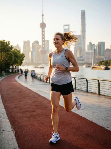 写实风格摄影,一名穿着深色运动背心和黑色短裤的男性正在奔跑的背影,肌肉线条分明,姿态充满动感与力量,跑鞋细节清晰可见,阳光从侧后方照射,在人物身上形成明亮的轮廓光和明显的阴影对比,画面整体色调温暖,以金色和蓝色为主,高清晰度,细腻的质感表现,将原有的乡村道路环境改为清晨的城市滨江步道,地面铺设平整的灰色塑胶跑道,道路一侧是波光粼粼的江面,另一侧是整齐的绿化带和路灯,远处可见城市的天际线和朦胧的晨雾,保持原有的逆光拍摄角度和阳光效果,营造出清新、充满活力的运动氛围。