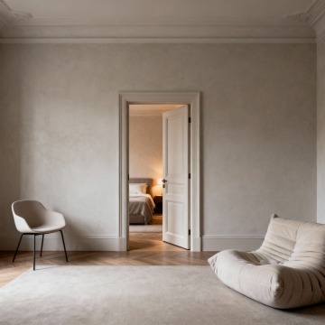 极简主义风格室内场景,柔和的米白色墙壁,自然光透过木质百叶窗和米色垂坠窗帘洒入,浅灰色木地板上铺着带有细腻波浪纹理的浅色地毯。房间中央是一张造型圆润、线条流畅的白色羊羔绒单人沙发,搭配一个橄榄绿色的方形靠垫。沙发旁是一个白色圆柱形边桌,桌面上摆放着一本翻开的书和一个插有细枝绿植的透明玻璃花瓶。沙发后方墙上悬挂着一幅现代抽象画,画作以棕色、米色、白色和橙色的大胆笔触构成,带有明显的颜料肌理感。右侧是嵌入式浅木色置物架,其中一层放置着一个透明玻璃花瓶,里面插有绿色植物。整体色调温暖柔和,光影层次丰富,营造出宁静、舒适、简约而不失格调的居住氛围,空间布局通透,细节处理精致,具有现代简约的高级设计感。