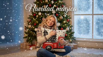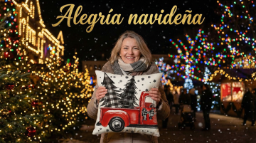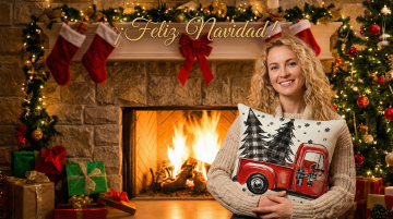 以图中的圣诞枕套为元素,欧美女人抱着圣诞枕套,物体主体特征不变,设计6张跟圣诞枕套有关的图,可以适当加一些西班牙语的文案点缀一下,比例 16:9
