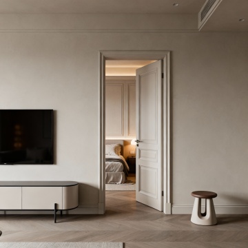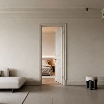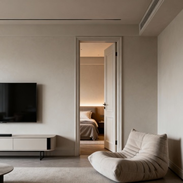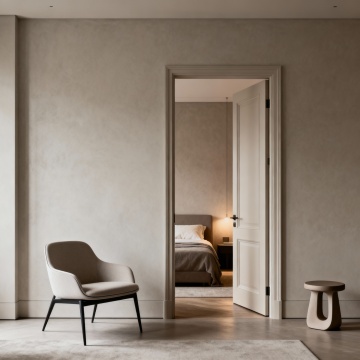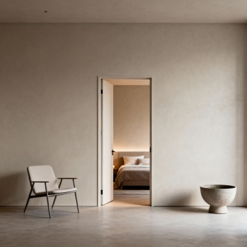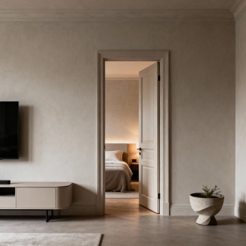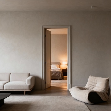 现代极简主义卧室,深棕色实木床头板与床头柜,纹理清晰自然,搭配浅米色与深灰色床品,柔软的白色枕头与棕色靠垫,右侧黑色墙面带有嵌入式暖黄色灯带,床头柜上摆放着带有黄色花朵的花瓶,整体色调沉稳温暖,柔和的侧光营造出宁静舒适的氛围,光影层次分明,材质质感细腻真实,空间布局简洁有序,具有高级的现代家居设计感。