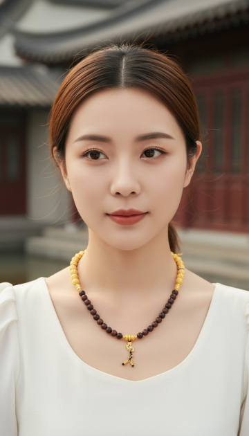 将图中【黄金檀木挂串】戴在写真模肤白嫩肤的脖子上,珠子小点、直径缩短,小巧,颜色样式和数量要和图中的一样,【图中视频要高还原度】东方唯美