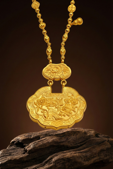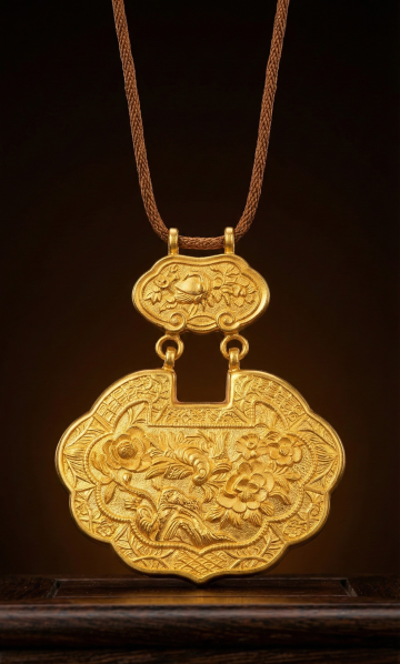 将图中【黄金檀木挂串】等比例戴在东方模特肤白嫩肤的脖子上,串的颜色样式和数量要和图中的一样,【高度还原参考图中的黄金饰品】,图片真是自然点,东方唯美