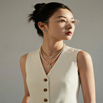 半身构图,亚洲年轻女性微微侧身45度,左手无名指轻触锁骨处珍珠项链的坠子,右手自然垂落于身侧,浅棕色中长发在柔和光线下呈现出蜜糖般的层次感,几缕发丝随动作轻轻拂过纤细的脖颈。自然妆容强调通透质感,浅棕色眉毛如自然生长般柔和,内眼线仅在眼尾处微微上扬,淡粉色眼影如晨雾般晕染眼窝,珊瑚色唇膏中央点缀着一丝透明唇蜜,光泽感底妆在偏侧光下展现出细腻的皮肤纹理。简约的金色几何耳坠随着头部微倾的弧度轻轻晃动,白色丝质吊带裙的肩带在肩胛骨处形成优雅的V形线条,背景是带有微妙纹理的奶油白,光线从左上方45度角温柔洒落,在颈部和锁骨处形成渐变的柔光过渡,整体氛围如同被时光定格的静谧午后,极简主义构图中蕴含着含蓄的优雅张力。