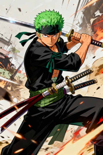 画面中有许多经典索隆场面呈螺旋状排列,主人公草帽一伙在旋转的海报中行走。固定聚焦在他身上,周围呈现朦胧模糊、涂抹、拖影的效果。