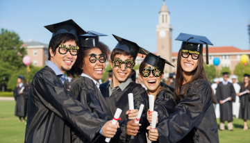 替换图中的模特,不能改变图中眼镜外观,背景为毕业季活动背景,要求画面清晰,光线明亮,丝滑流畅,生成2张不同角度和背景的图片