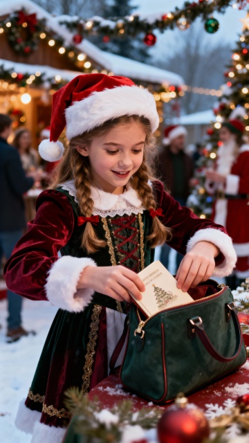 雪夜小镇,彩灯闪烁,圣诞树璀璨,孩童嬉戏,暖光映雪,节日氛围浓郁而温馨。