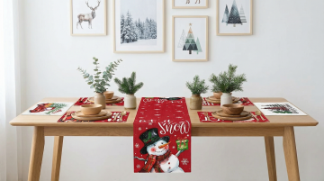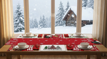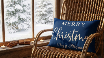 以图中的圣诞腰枕套为元素,乡村小屋冬季假日靠垫套,物体主体特征不变,设计6张跟圣诞腰枕套有关的图,可以适当加一些西班牙语的文案点缀一下,比例 16:9