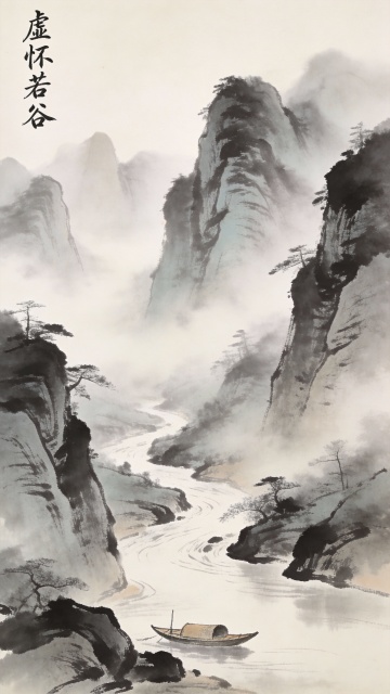 新中式水墨风格山水画卷,以柔和的青绿色调为主,远处层叠的山峦在薄雾中若隐若现,近处平静的湖面上一叶扁舟静静漂浮,岸边点缀着几株水墨风格的树木,天空中一群飞鸟自由翱翔,整体画面营造出宁静悠远的意境,构图采用传统山水画的高远视角,留白恰到好处,展现出空灵淡雅的东方美学韵味。