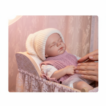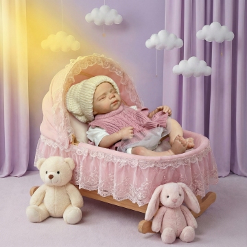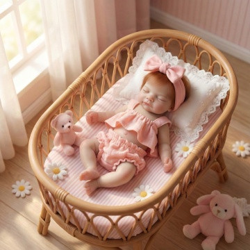 婴儿床场景:白色木质婴儿床配条纹床单,娃娃侧卧屈膝,手抓床沿栏杆,背景挂卡通挂饰,温馨日常感适配母婴用品