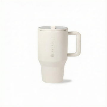帮我生成这个不锈钢保温杯子的透视图,一半是热水,一半是冰可乐