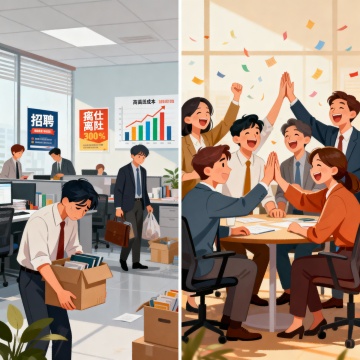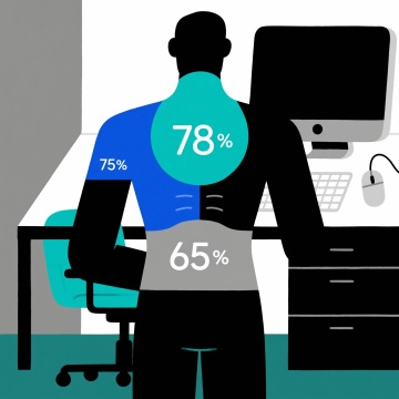 Corporate office scene, left side showing tired employees with coffee cups, dark circles, slumped postures, right side same employees energetic, bright-eyed, good posture with glowing energy aura around shoulders, minimalist flat illustration, blue and orange color theme, clean background --style flat --ar 16:9