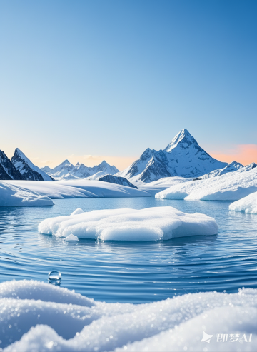 3D风格的虚拟自然场景,玻璃质感冰块漂浮于湖面,折射金色雪山光影,清透静谧,唯美感十足。