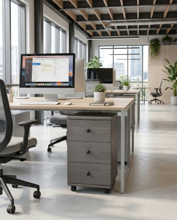 高写实3D渲染风格的现代办公室内部场景,采用明亮通透的采光设计,大面积落地窗引入自然光,窗外可见城市高楼与秋季树木景观。室内以浅灰色、白色和原木色为主色调,搭配深灰色地面,形成简洁专业的色彩和谐。天花板悬挂整齐排列的长方形LED平板灯,与自然光共同营造柔和均匀的光影效果,地面投射出清晰的窗格阴影。开放式办公布局,配备浅色实木办公桌、黑色办公椅、白色文件柜和黑色电脑显示器,书架上整齐摆放书籍和文件夹,窗台及办公桌角落点缀绿色植物增添生机。空间线条简洁流畅,展现出现代、简约、高效的办公氛围,可从不同角度(如靠窗视角、办公室中央视角、走廊视角等)展示,环境可替换为不同城市景观(如商业区、公园旁、海滨等)的办公室背景。